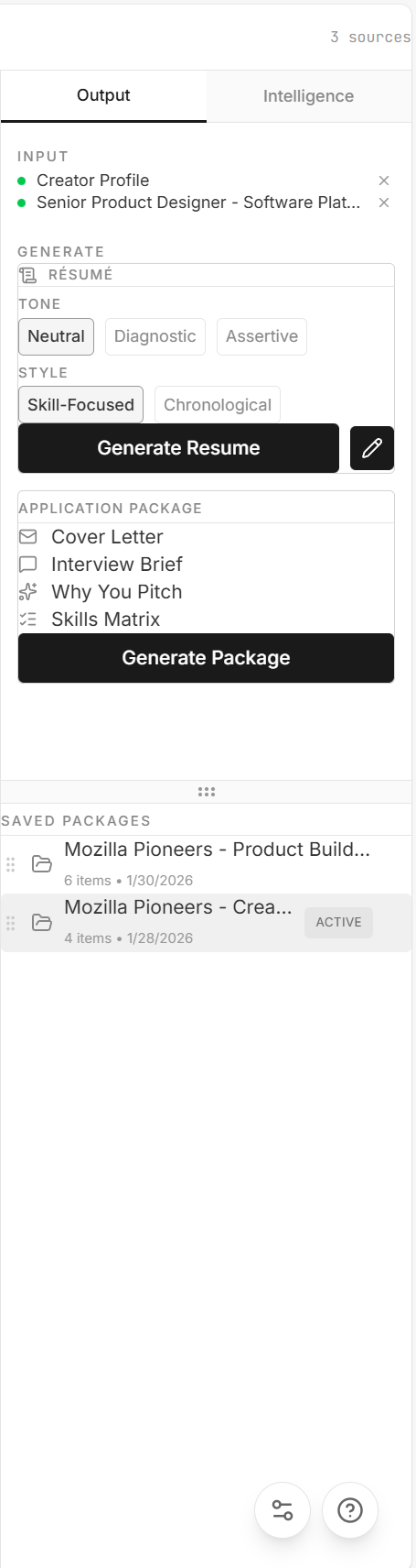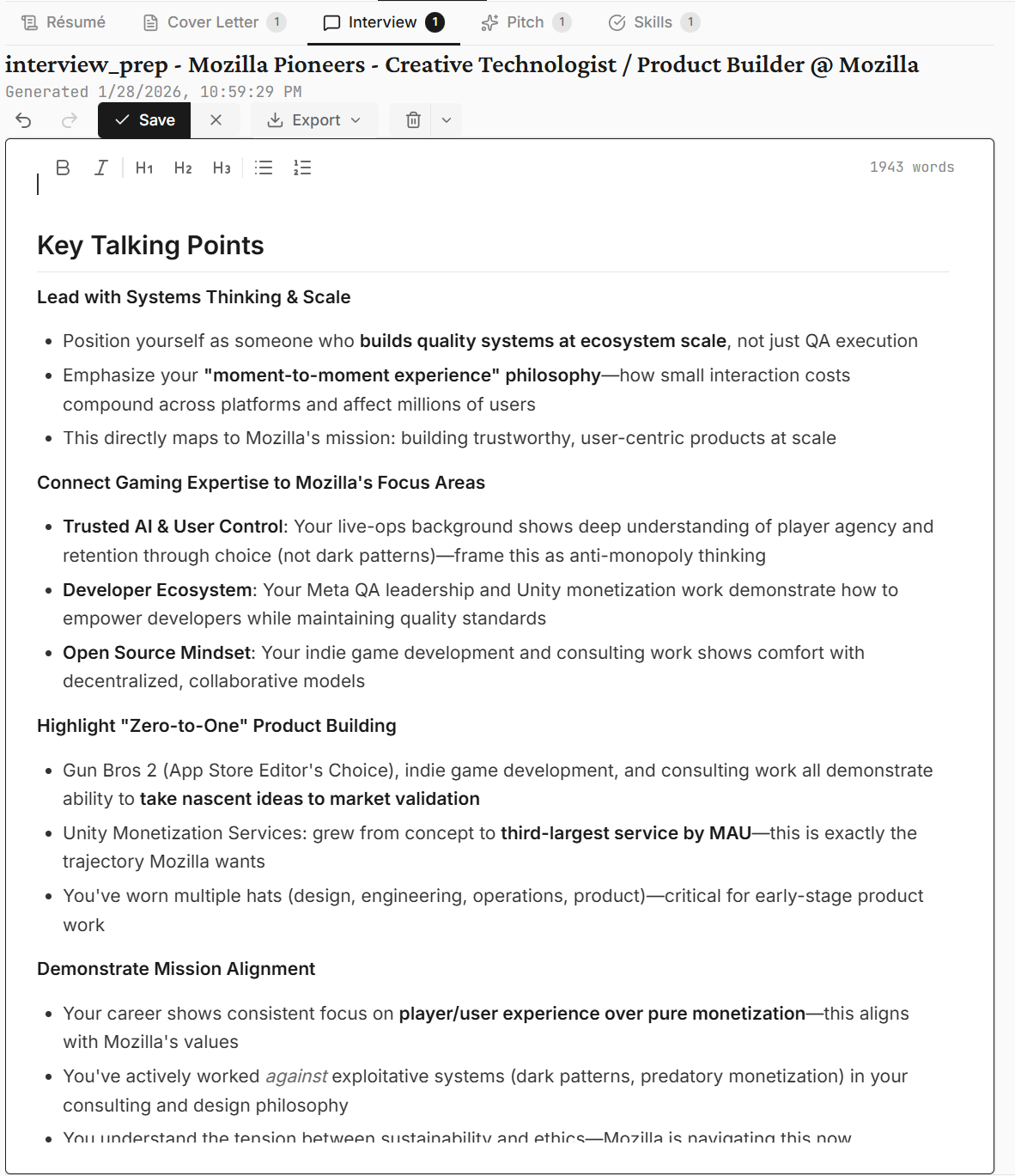 Once sources are loaded and a profile is active, the output panel generates the full application package in one pass: resume, cover letter, interview prep, skills matrix, and a "Why You" pitch. Each document is tailored to the specific job, not a generic template. The interview prep generates both key talking points and suggested Q&A pairs grounded in your actual experience. The pitch generates multiple variants (phone screen, final round) so you have the right register for each stage.