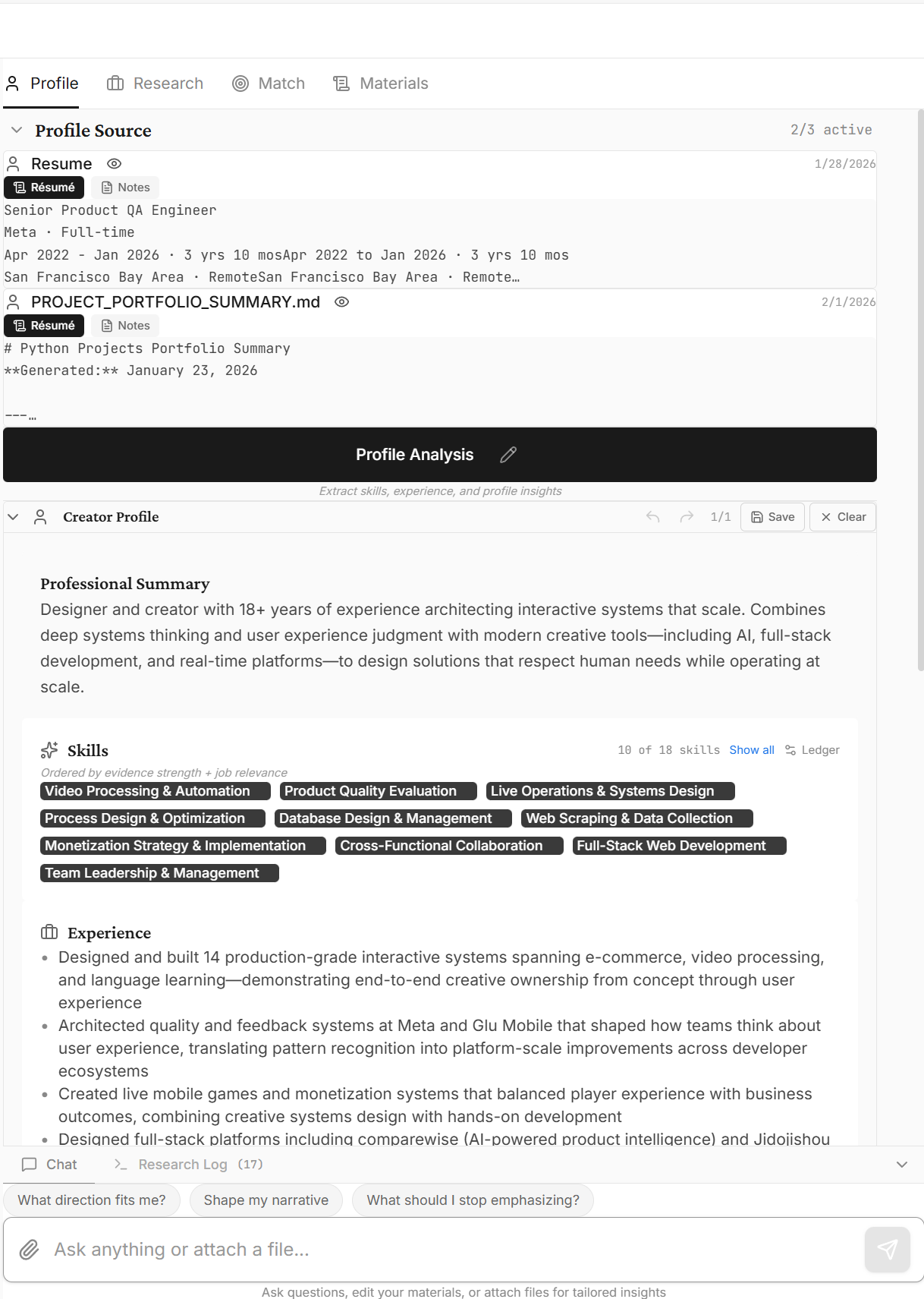 Profile Analysis reads across all your uploaded documents and extracts a structured career record: professional summary, tagged skills, experience bullets. Match Analysis then scores how well your profile aligns with the job by skill overlap, seniority fit, and requirement gaps. Both outputs are read-only in the session layer. Nothing is written to your permanent record without deliberate approval. The AI can suggest edits to your profile; you decide what sticks.