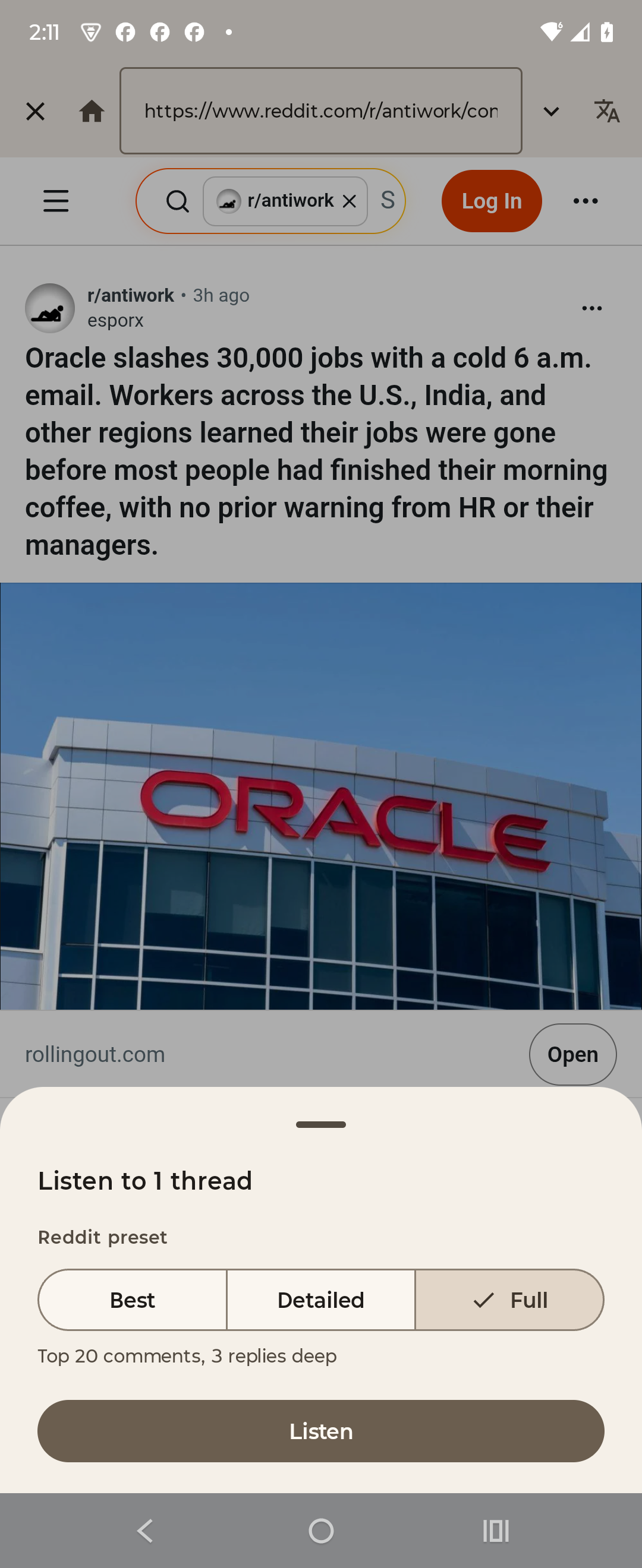 Open any thread and tap Listen. A bottom sheet shows the preset and depth before you commit. Best, Detailed, or Full. Choose how much of the thread you want. The audio generates on-device from that point, no upload, no account, no waiting for a server.