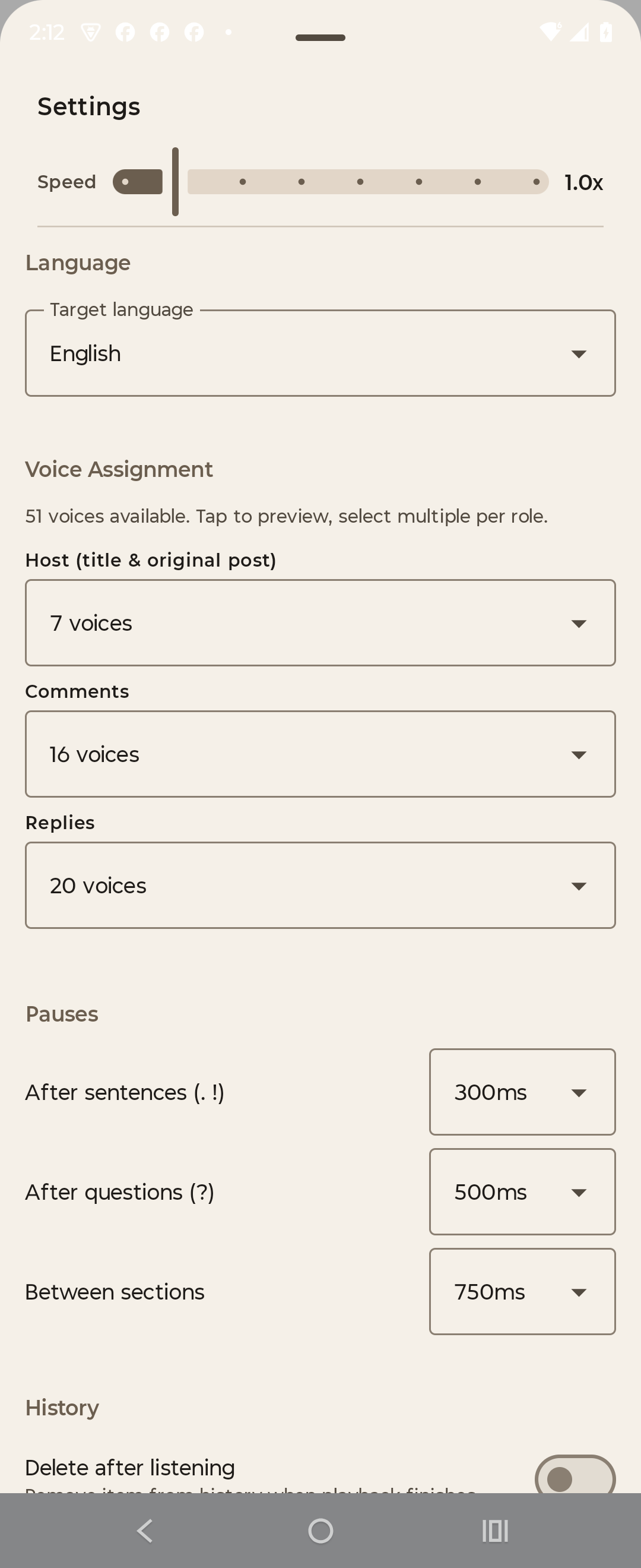 51 voices available, assigned separately to host, commenters, and replies. Tap any voice to preview it before assigning. Pause durations are configurable per punctuation type: sentence, question, section break. Speed is adjustable. History can be set to delete after listening. Everything runs locally; settings are just preferences, not a profile.