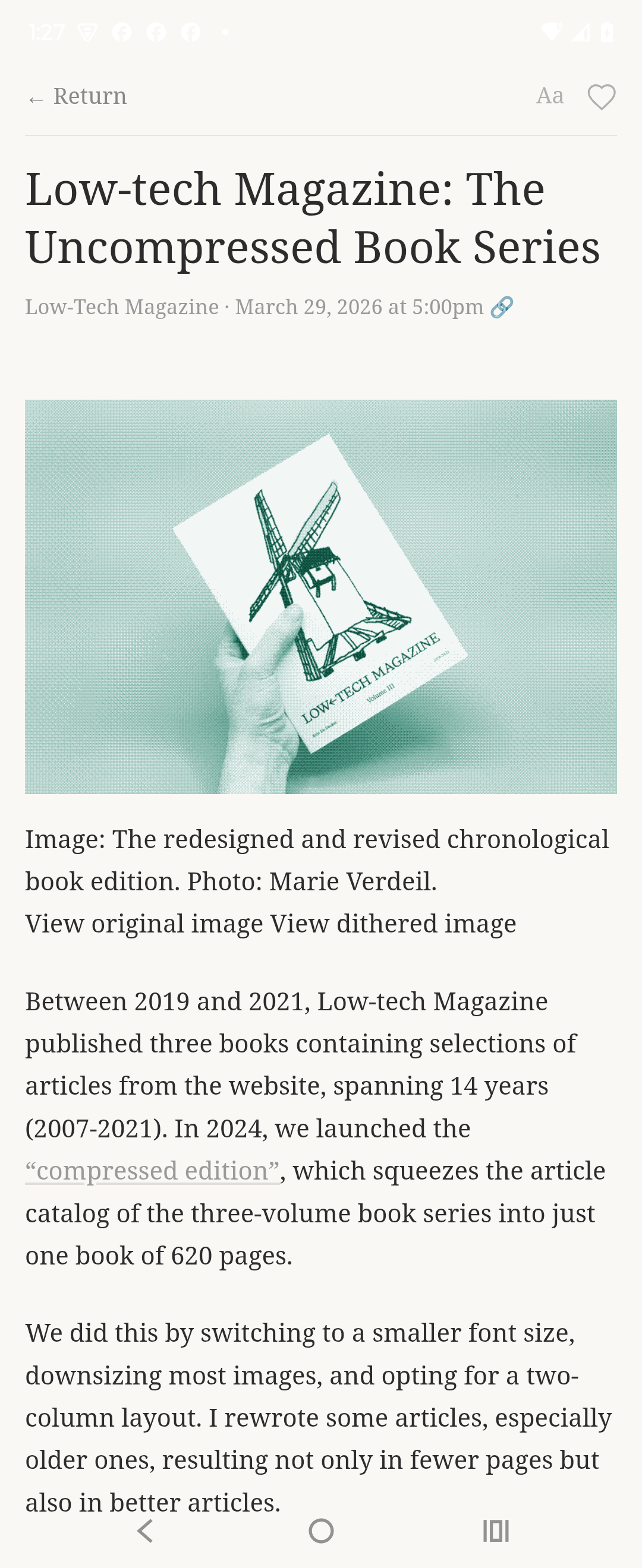 Slow Web generates one edition per day from the RSS feeds you choose. A finite page, like a newspaper. You open it, read through it, reach the last article, and there's nothing below. No pull-to-refresh. No second edition. Miss a day or a week; old editions sit in the archive if you want them, but they don't ask for anything.