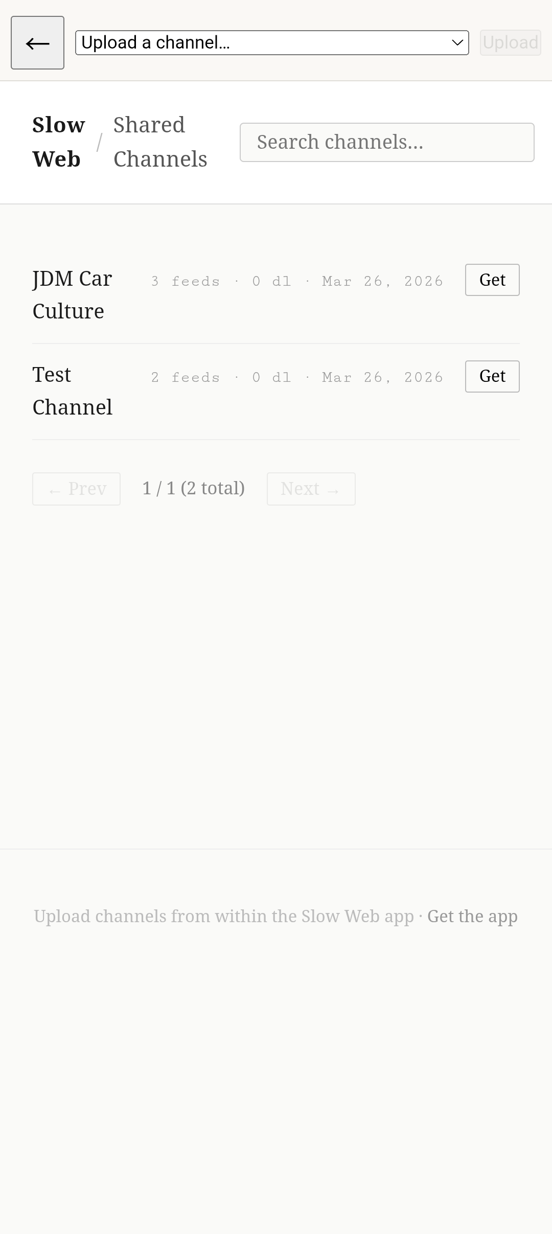 Building a feed takes some effort. You choose which voices, publications, and creators show up in your edition rather than letting an algorithm decide. Multiple points of view, human-curated, in chronological order. Channels are RSS feed bundles organized by topic. Slow Web ships with seeded channels and any user can publish their own to a shared community directory. Others browse and add it with one tap, no accounts needed. Once an edition is generated it stays on your device. Read on the train, on a plane, in a park, or come back to it a year later. Every past edition is in a searchable archive. Highlights and channel data can be exported.
